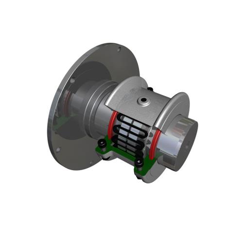 蛇簧聯軸器的結構緊湊、外形尺寸小,適用于連接兩同軸線的中、大功率的傳動軸系。具有補償兩軸相對偏移的減震、緩沖性能。工作溫度為-30℃-+150℃,傳遞公稱轉矩52-931000N.m.一般兩軸相對的許用位移量:軸向為4-20mm;徑向為0.5-3mm;角位移為1°15′。蛇簧聯軸器應用于各工業領域。